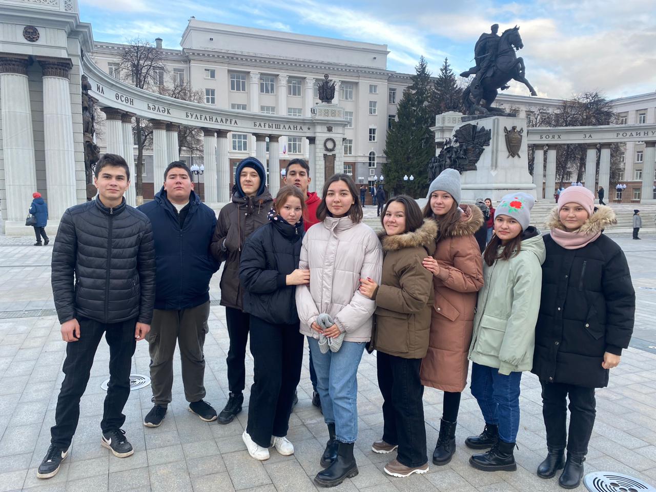 Во время осенних каникул ученики 9,11-х классов нашей школы побывали в столице нашей республики. Посетили музей Боевой Славы, мечеть Ляля-Тюльпан, национальный музей. Посмотрели кино в кинотеатре "Родина". Ребята в восторге от памятника генералу Шаймуратову .